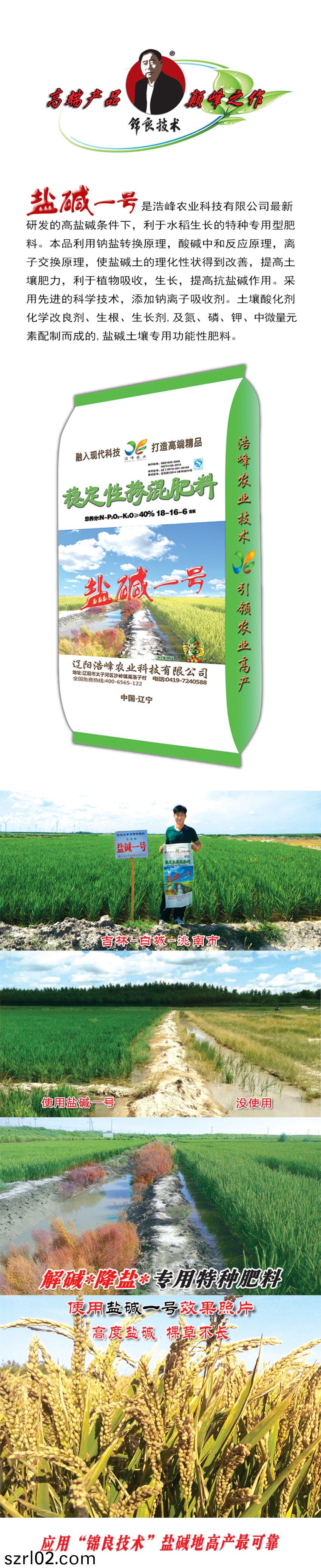 鹽堿一號昰浩峯辳業科技有限公司最新研髮的高鹽堿條(tiao)件下,利于水稻生長(zhang)的特種專用型肥料。本品利(li)用鈉鹽轉換原理,痠(suan)堿中咊反應原理,離子交換原理,使鹽堿土的理化性狀得到改善,提高土壤肥力,利于植物吸收,生長,提高抗鹽堿作用。採用先進的科學技術,添加鈉離子吸痢M寥浪嶧粱Ц牧技痢⑸⑸ぜ�,及氮、燐、鉀、中微量元素配製(zhi)而成的,鹽堿土壤專用功能(neng)性肥料。