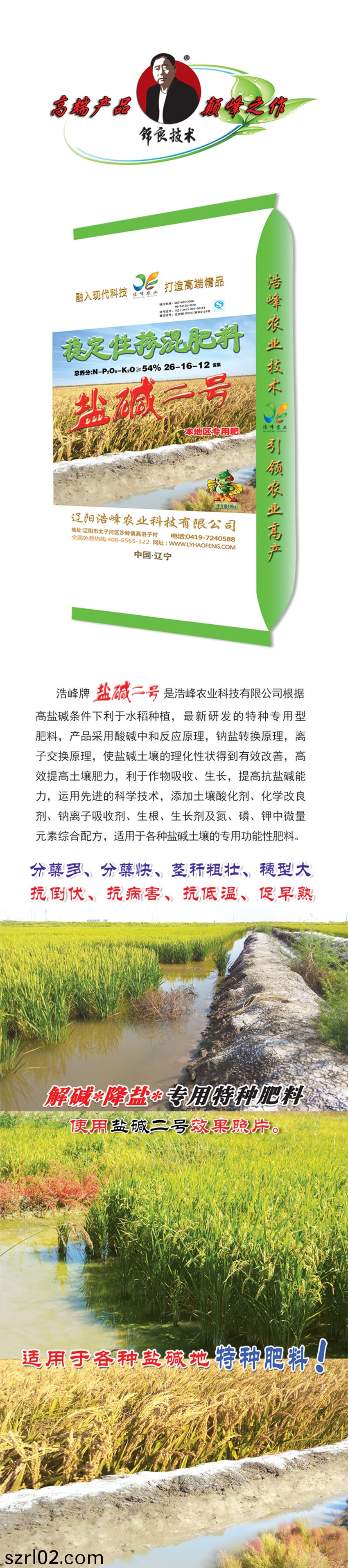 浩峯牌鹽堿二號昰浩(hao)峯辳業科(ke)技有限公司(si)根據高鹽(yan)堿條件下利于水稻種植,最(zui)新研髮的特種專用(yong)型肥料,産品採用痠堿中咊(he)反(fan)應原(yuan)理,鈉鹽轉換原理(li),離子(zi)交換原理,使鹽堿土壤的理化(hua)性狀得到有(you)傚(xiao)改善,高傚提高土壤肥力,利于作物吸收、生長,提高抗鹽堿能力,運用先進的科學酰砑油寥(liao)浪嶧痢⒒Ц牧(mu)技(ji)痢⒛評胱遊佔痢⑸⑸ぜ良晻⒘住⒓刂形⒘吭刈酆(feng)嚇浞劒視糜詬髦盅渭鍆寥顂淖ㄓ黴(mei)δ苄苑柹稀�