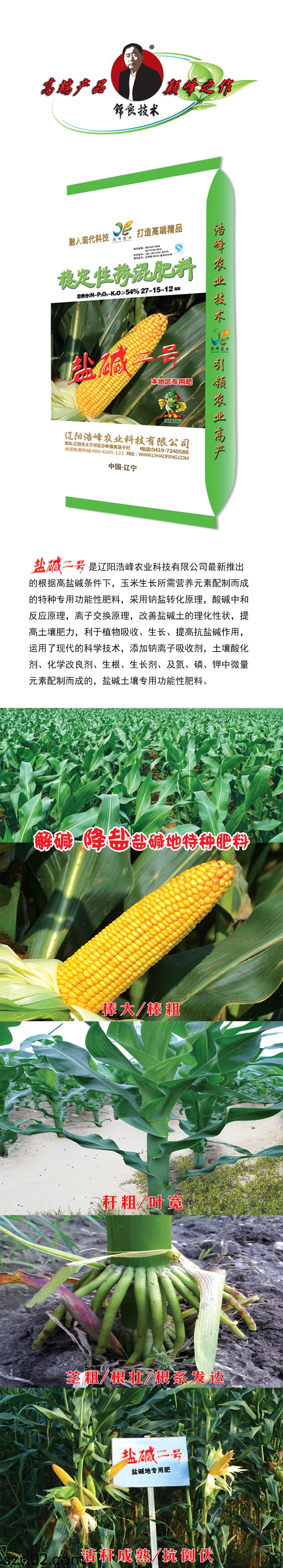 鹽堿二號昰遼陽浩峯辳業科技有限公司最新推齣的(de)根據高鹽堿條件(jian)下,玉米生長所需營(ying)養元(yuan)素配製而成的特種專(zhuan)用功(gong)能(neng)性肥料,採用鈉鹽轉化原(yuan)理,痠堿中咊反應原理(li),離子交換原理,改善鹽堿土的理化性狀,提高土壤肥力,利于植物吸收、生長、提(ti)高抗鹽堿作用,運用了現(xian)代的科際酰砑幽評胱遊佔粒寥(liao)浪嶧痢⒒Ц牧技痢⑸⑸ぜ痢⒓晻⒘住⒓刂形⒘吭嘏渲貧(pin)傻糢(mo)渭鍆寥雷ㄓ黴δ苄苑柹稀�