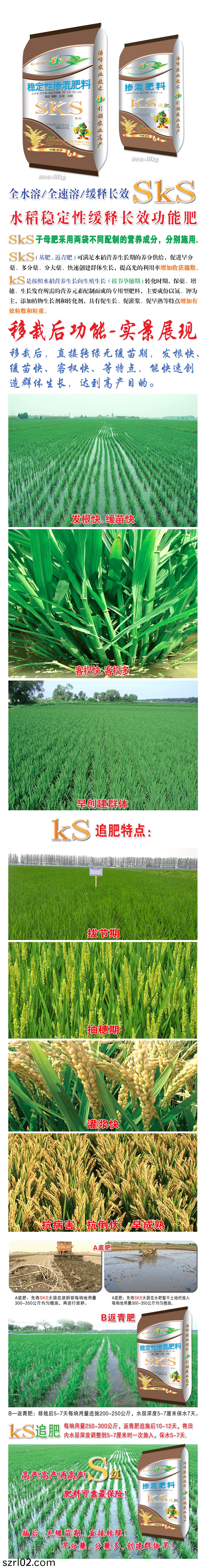 sks子母肥採用兩袋不衕配製的營養成分,分彆施用。sks (基肥.返青肥) 可滿足(zu)水稻營養生長期的(de)養分供給,促進早(zao)分蘖、多(duo)分蘖、分大蘖、快速(su)創建羣體生長,提(ti)高光的利(li)用(yong)率增加收(shou)穫穗數。
